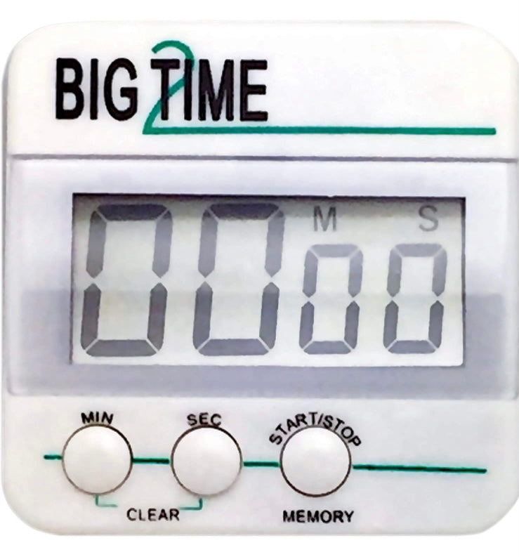 La minuterie Big Time, Too compte 100 minutes vers le haut ou vers le bas, avec une alarme. Comprend également un aimant et un support à l'arrière. Une pile AAA est requise (non incluse). Mesure 2,5" x 2,5".