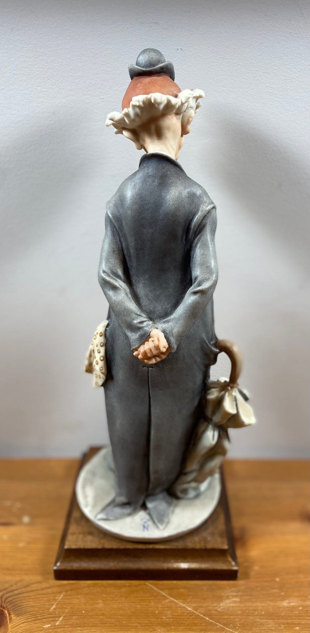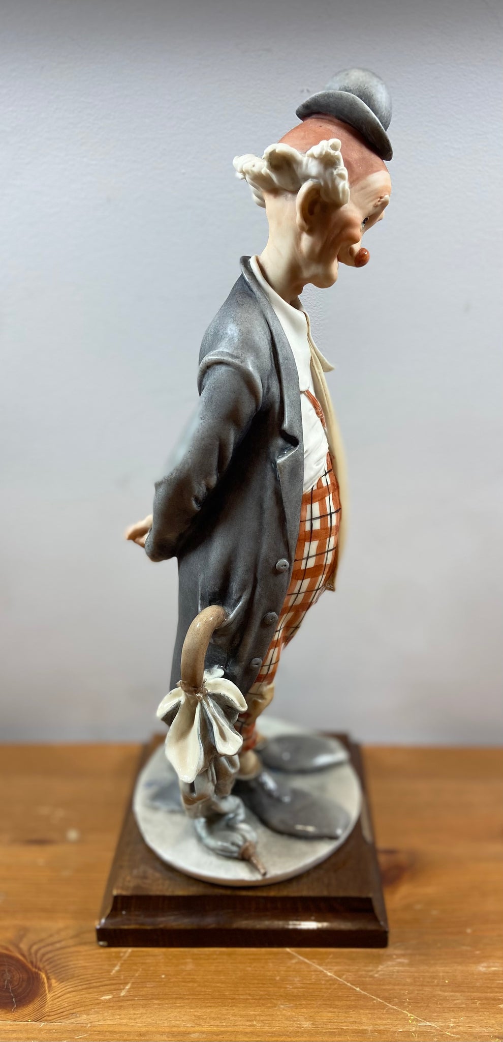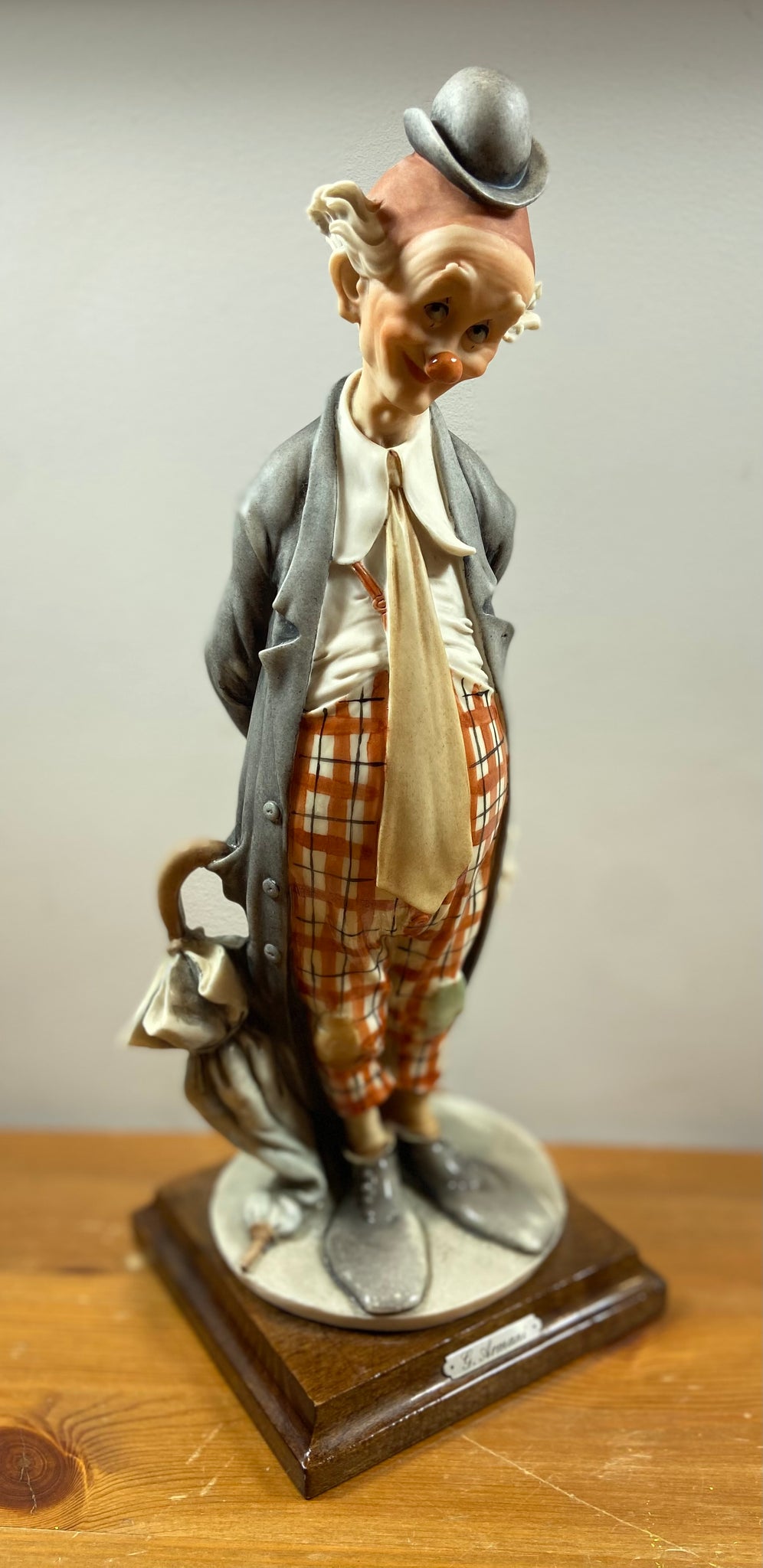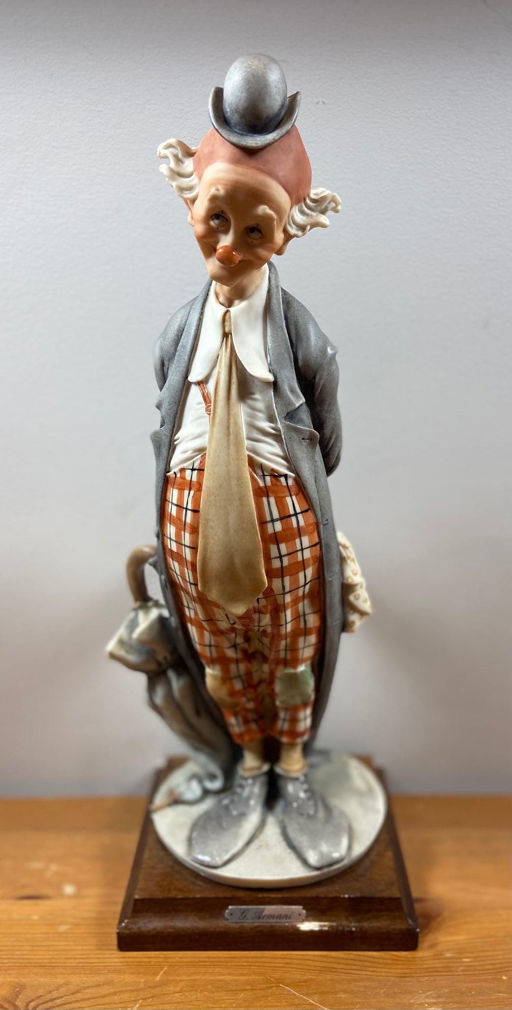 Élégante figurine de clown signée G. Armani, réalisée en porcelaine fine avec un socle en bois. Cette pièce représente un clown mélancolique au chapeau melon, vêtement gris et pantalon à carreaux, tenant un parapluie. Parfait pour les collectionneurs ou pour ajouter une touche artistique et rétro à votre décor.