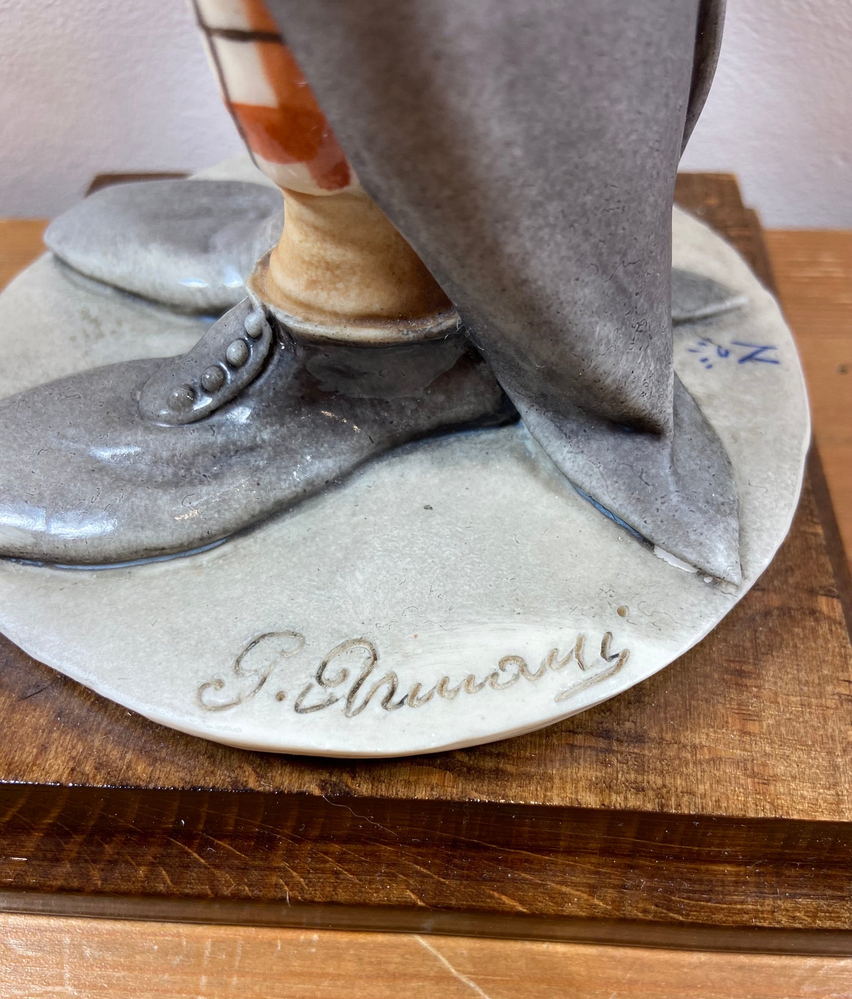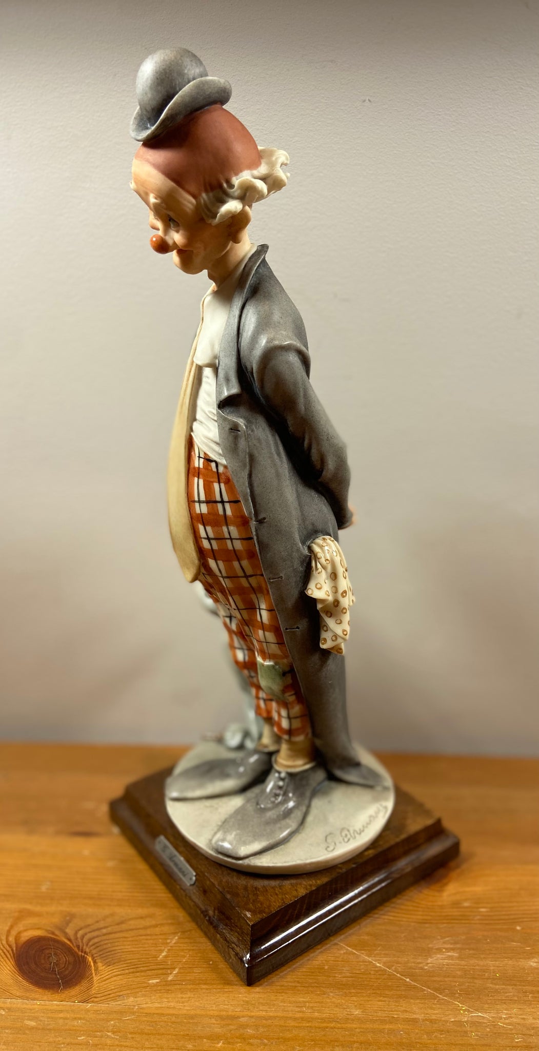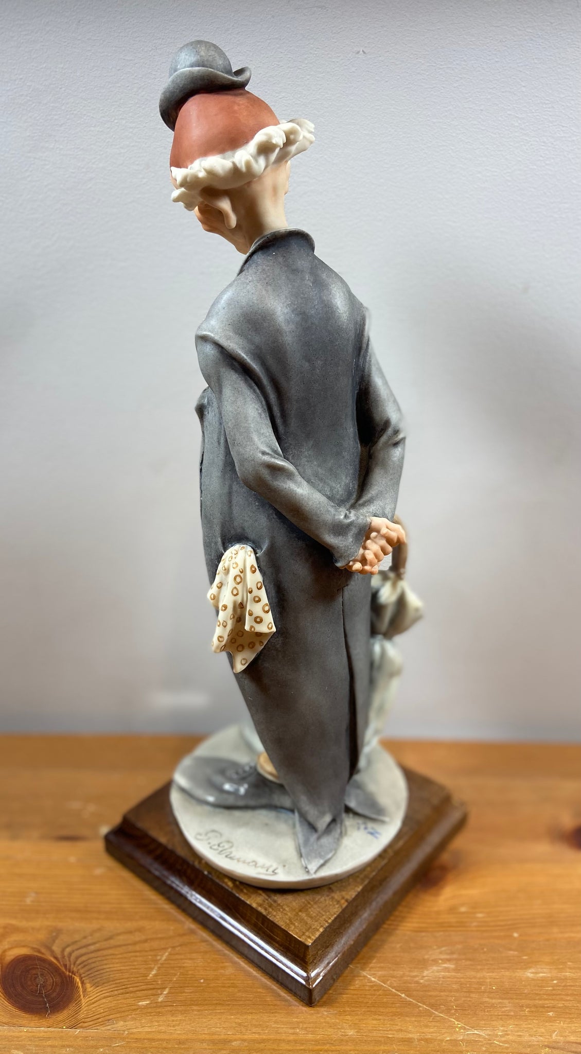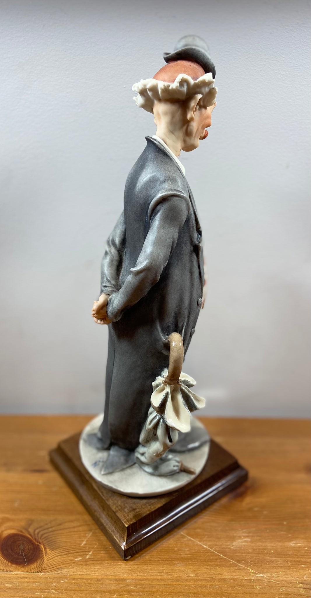 Élégante figurine de clown signée G. Armani, réalisée en porcelaine fine avec un socle en bois. Cette pièce représente un clown mélancolique au chapeau melon, vêtement gris et pantalon à carreaux, tenant un parapluie. Parfait pour les collectionneurs ou pour ajouter une touche artistique et rétro à votre décor.