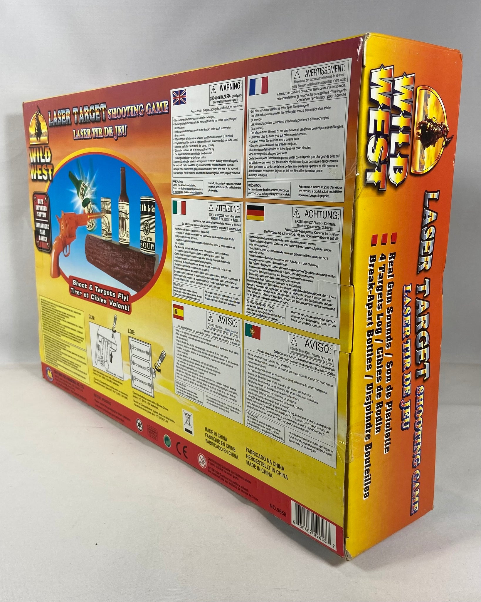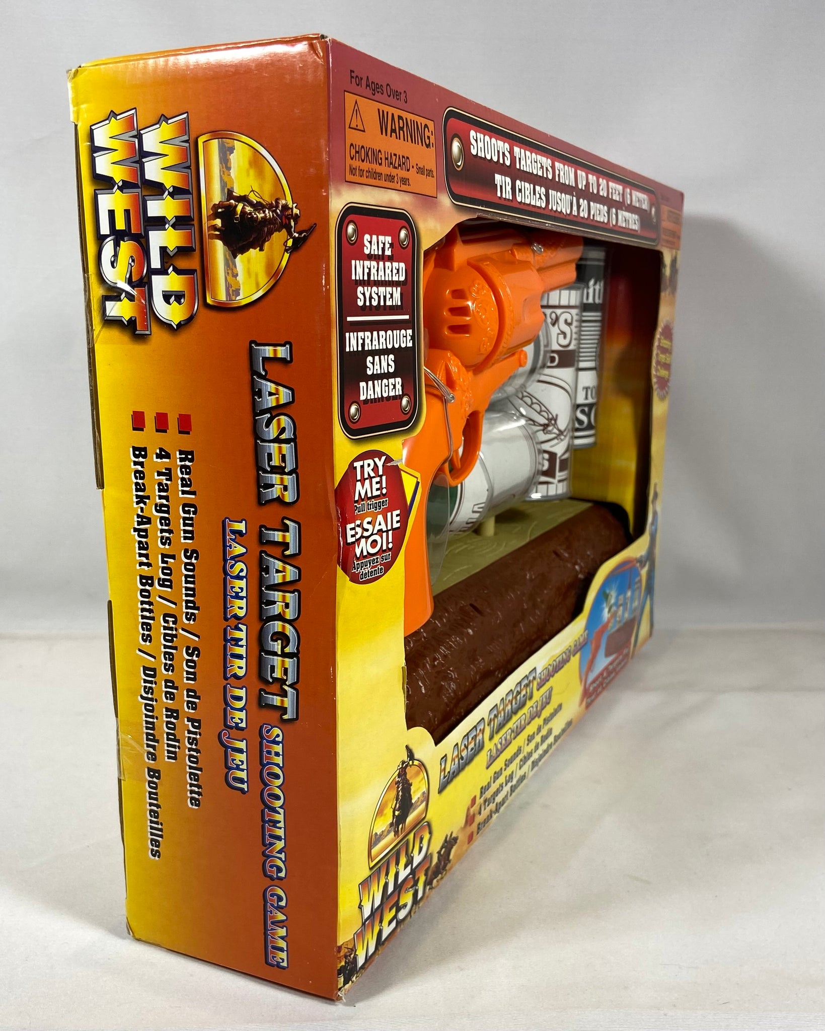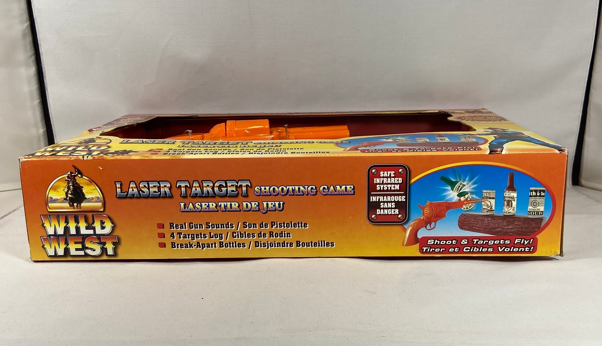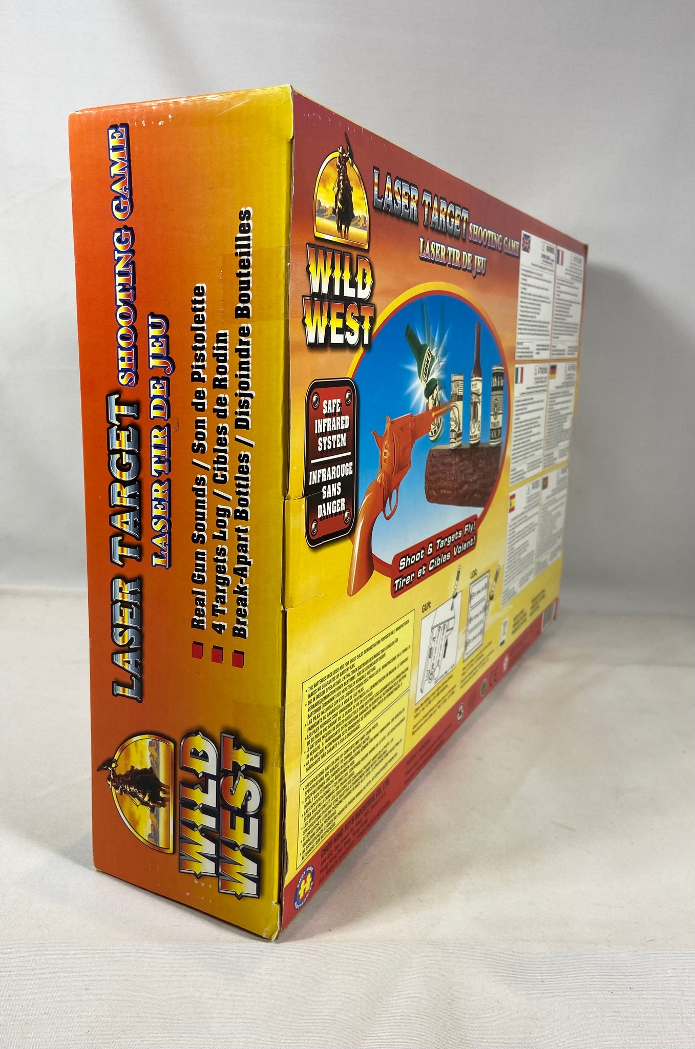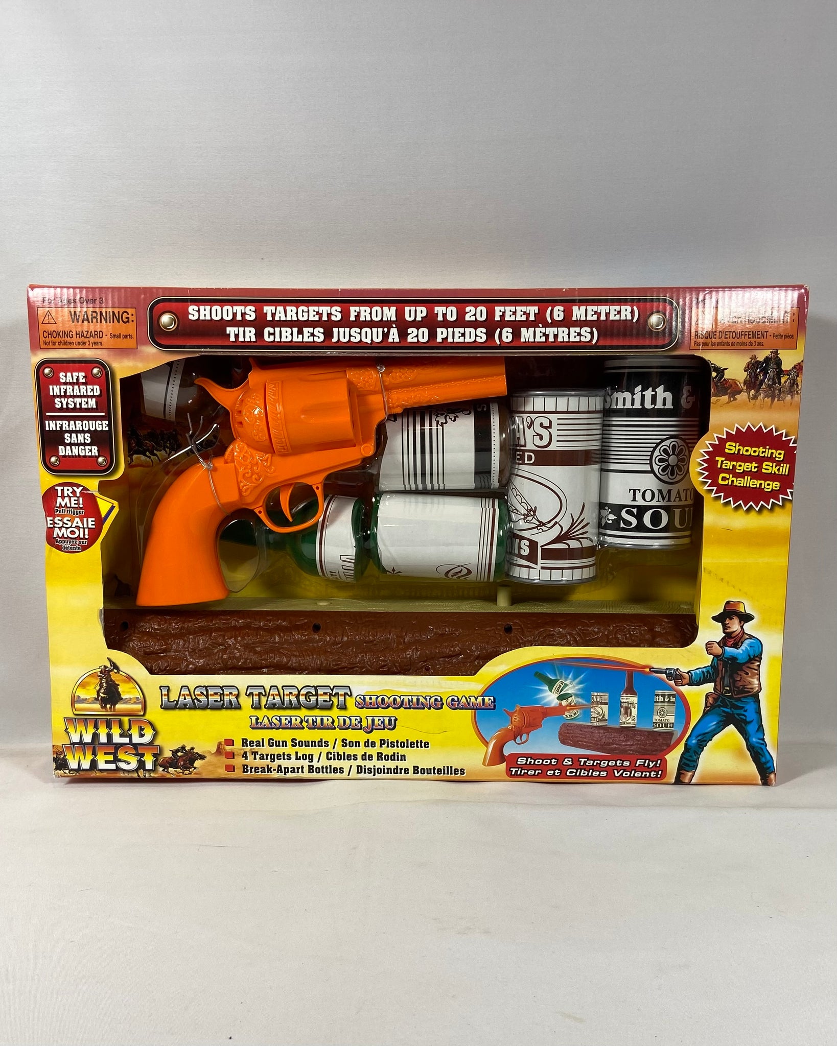 Jeu de tir laser thématique Far West avec pistolet, cibles et accessoires, idéal pour le jeu intérieur sécuritaire et les amateurs de jouets rétro.