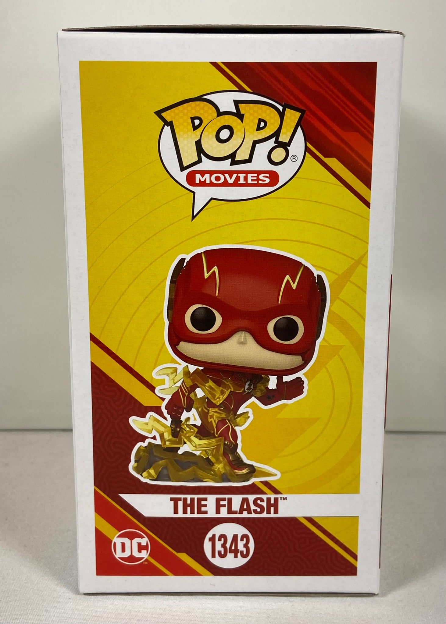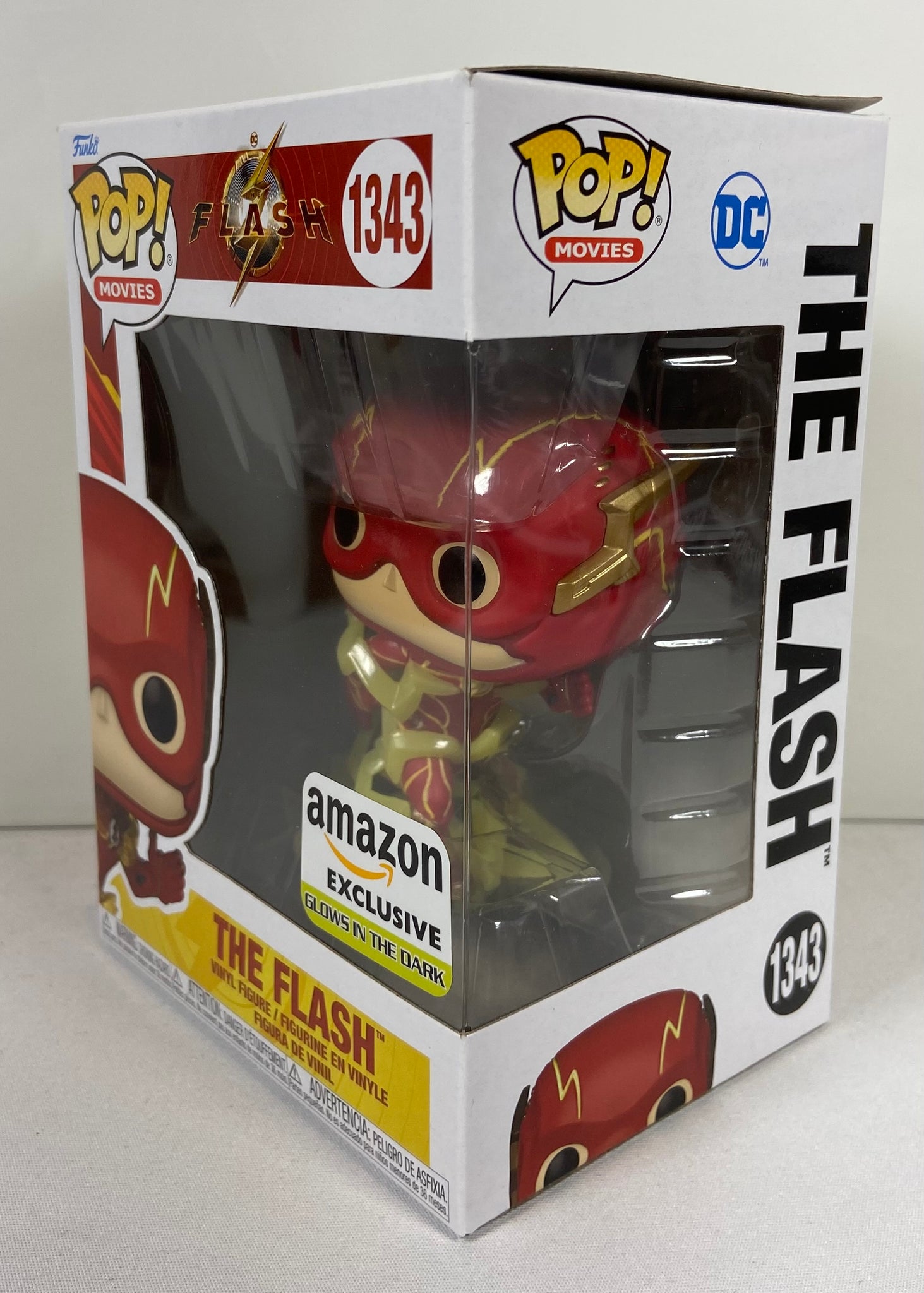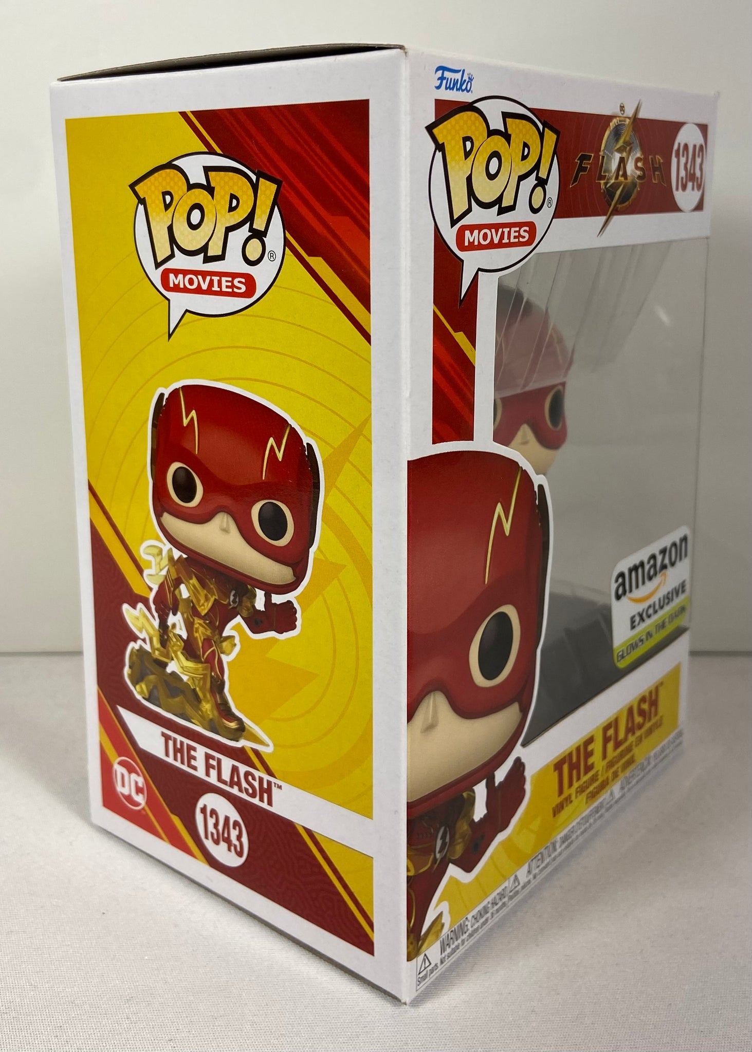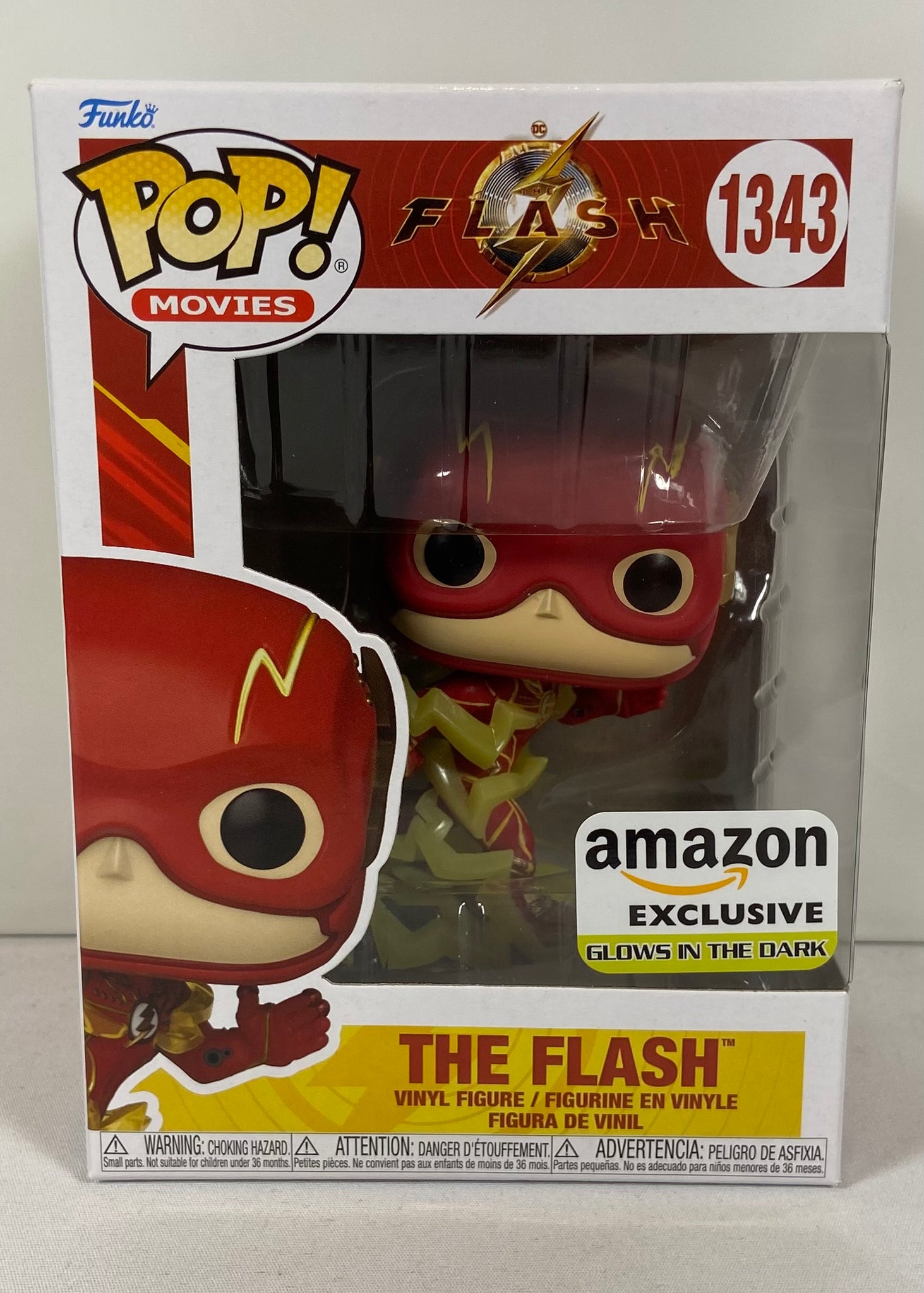 Funko Pop officielle du film The Flash (#1343), édition Amazon Exclusive avec finition Glow in the Dark. Version dynamique avec éclair jaune translucide et base détaillée. Un excellent ajout pour collectionneurs DC Comics ou amateurs du film de 2023.