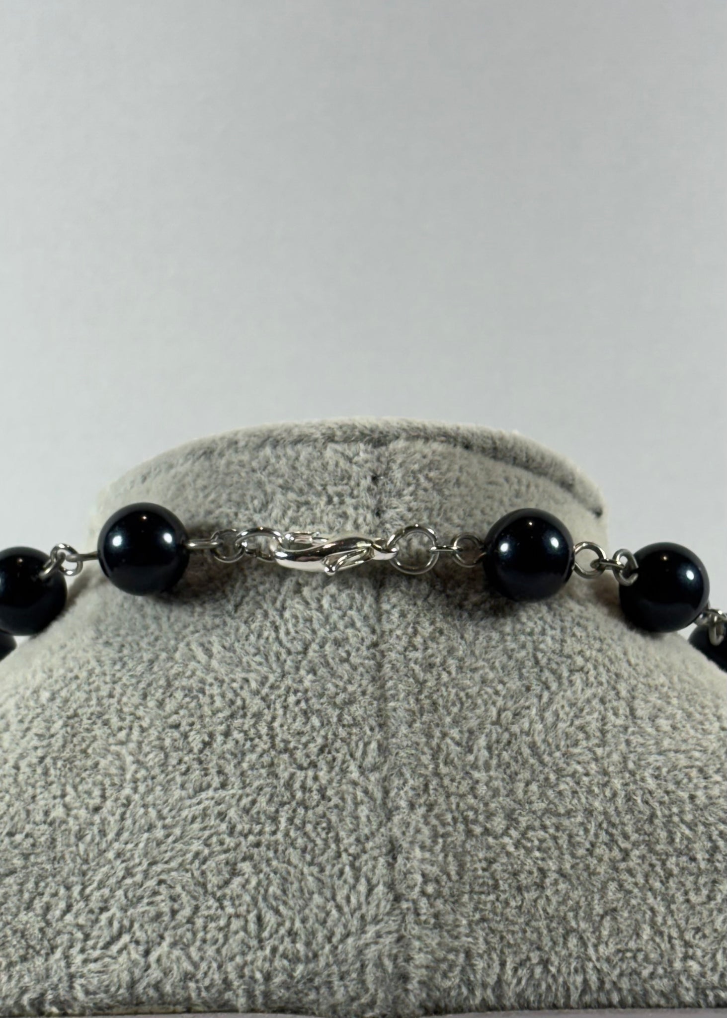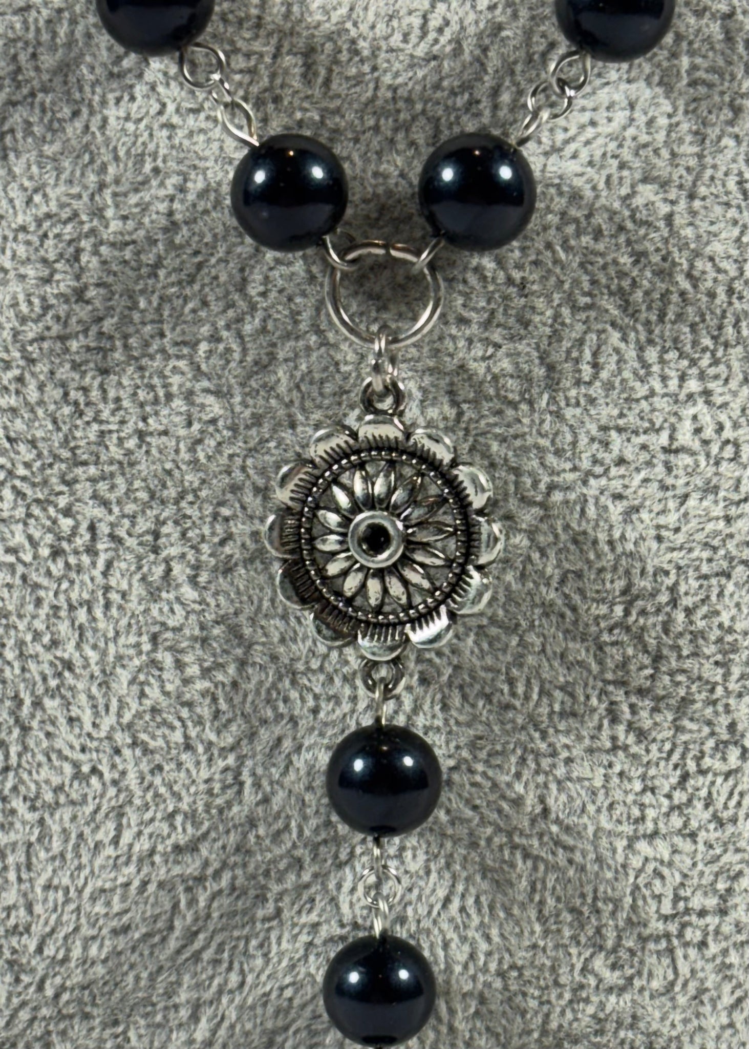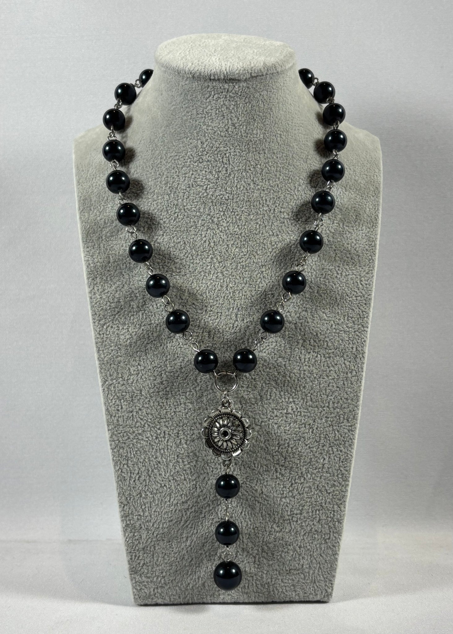 Also available for English customers – Handmade long black pearl necklace with silver floral pendant. Free shipping in Quebec and secure checkout via credit card, Apple Pay or Shop Pay.