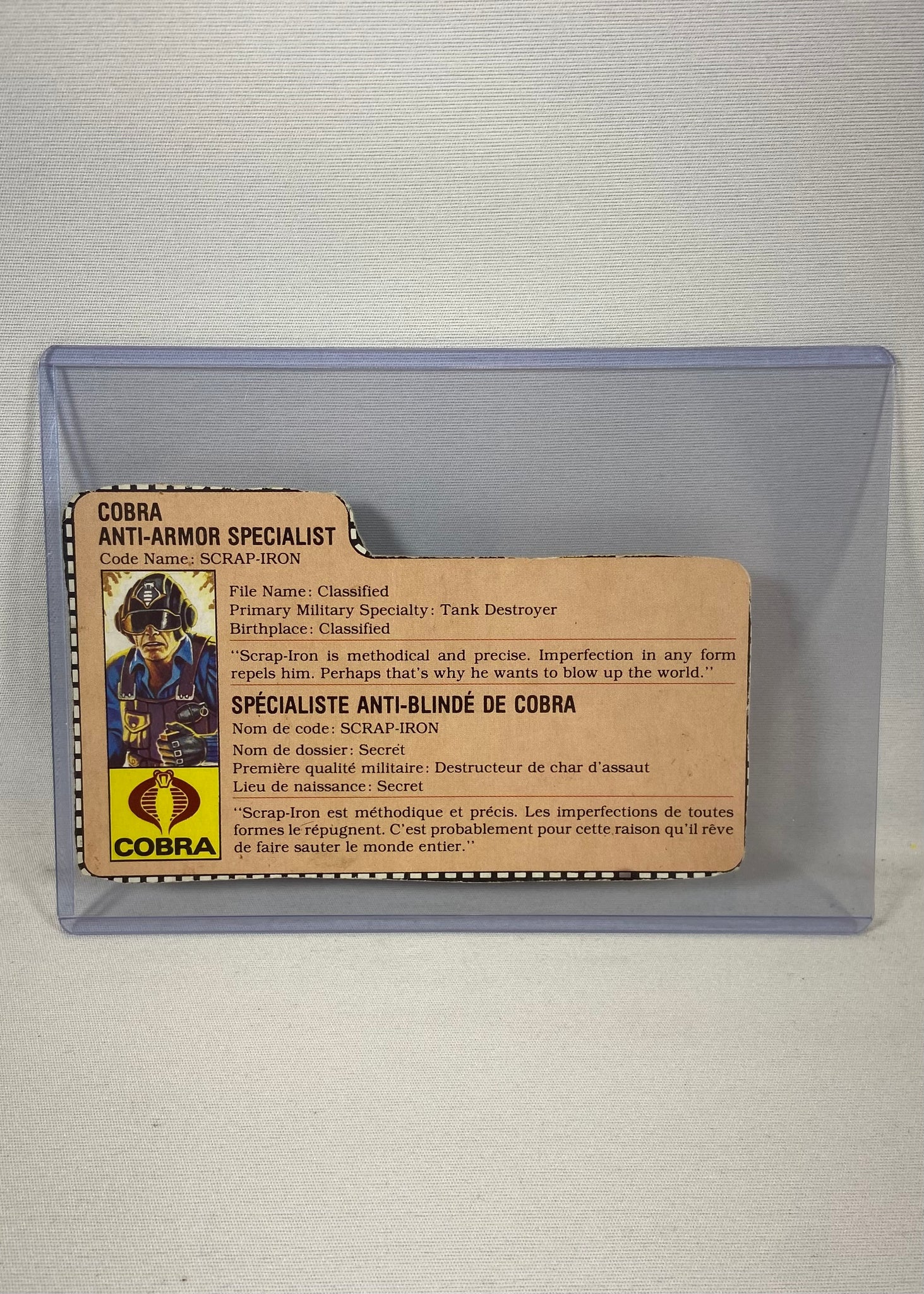 Also available for English customers – Vintage G.I. Joe “Scrap-Iron” file card (Canadian bilingual edition) with protective holder. Fast delivery in Quebec and secure checkout.