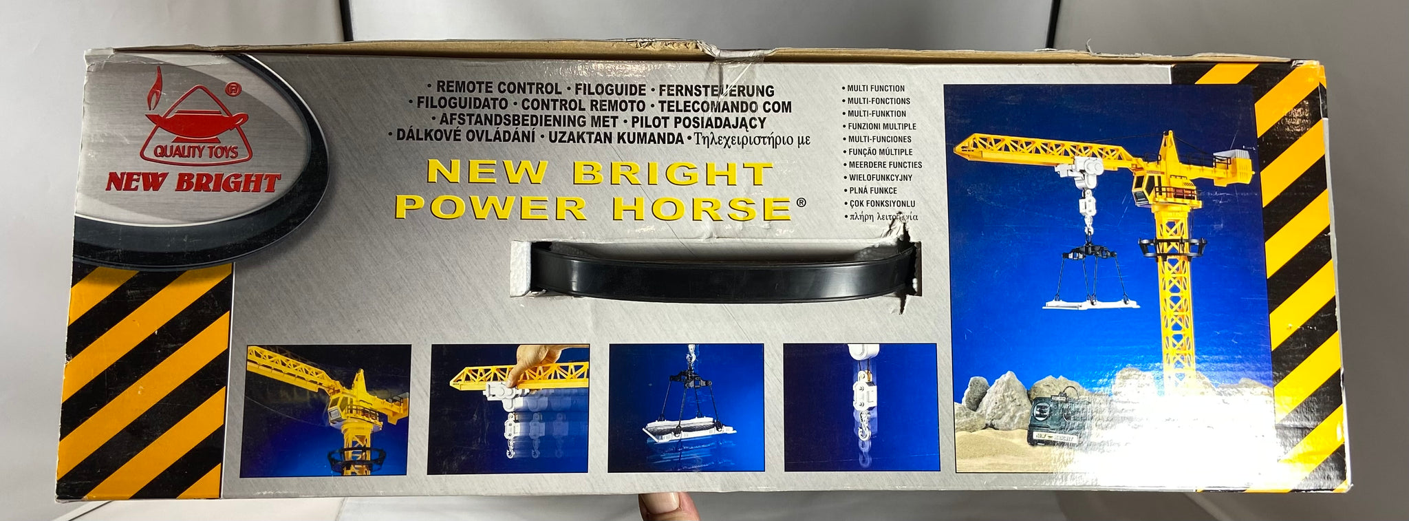 Grue télécommandée New Bright Power Horse, modèle multifonction avec rotation, levage et manipulation de charges. Cet ensemble comprend une grande grue de chantier motorisée, une télécommande filaire ainsi que plusieurs accessoires de construction. Un jouet impressionnant par sa taille et ses fonctions, idéal pour les amateurs de véhicules de chantier.