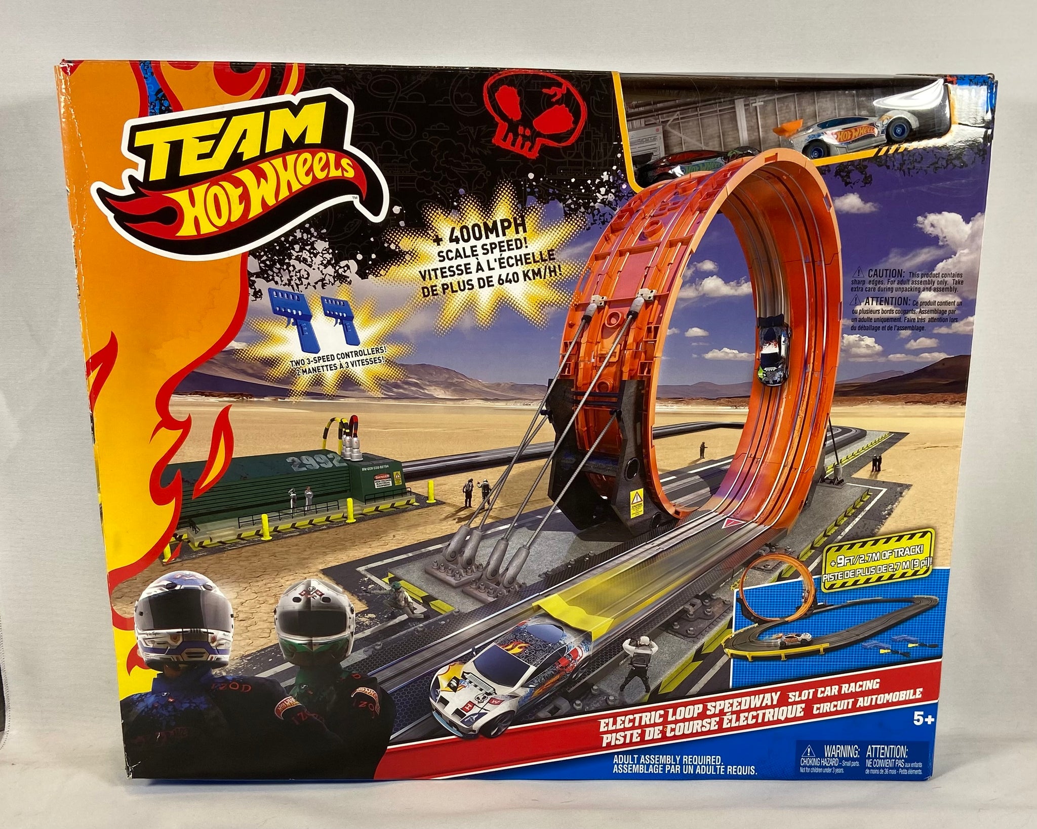 Piste de course électrique Team Hot Wheels Electric Loop Speedway, neuve et scellée. Ce circuit emblématique propose une grande boucle verticale, une piste de plus de 2,7 mètres et des voitures Hot Wheels incluses. Un ensemble spectaculaire autant pour le jeu que pour la collection, issu de la gamme Team Hot Wheels.