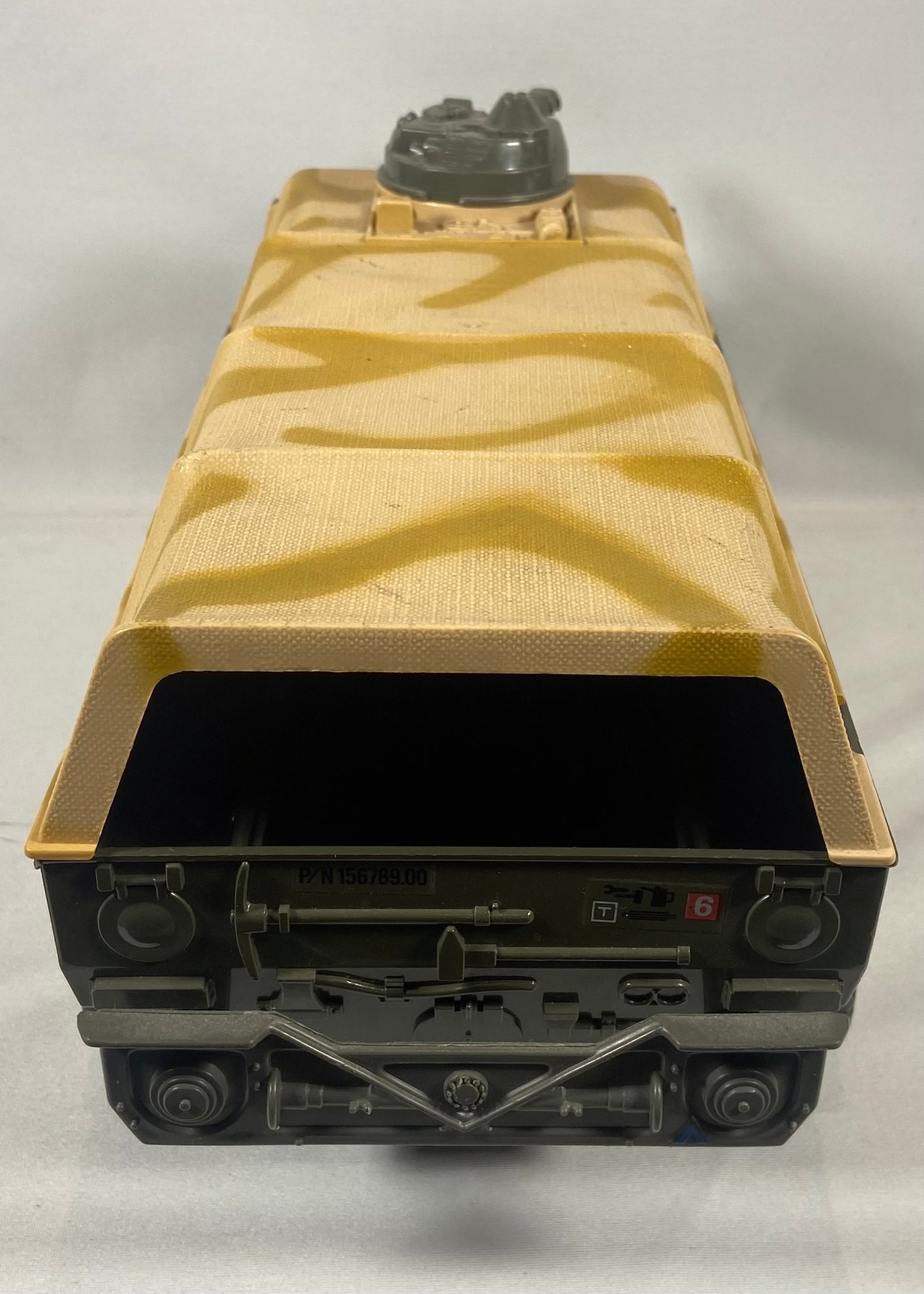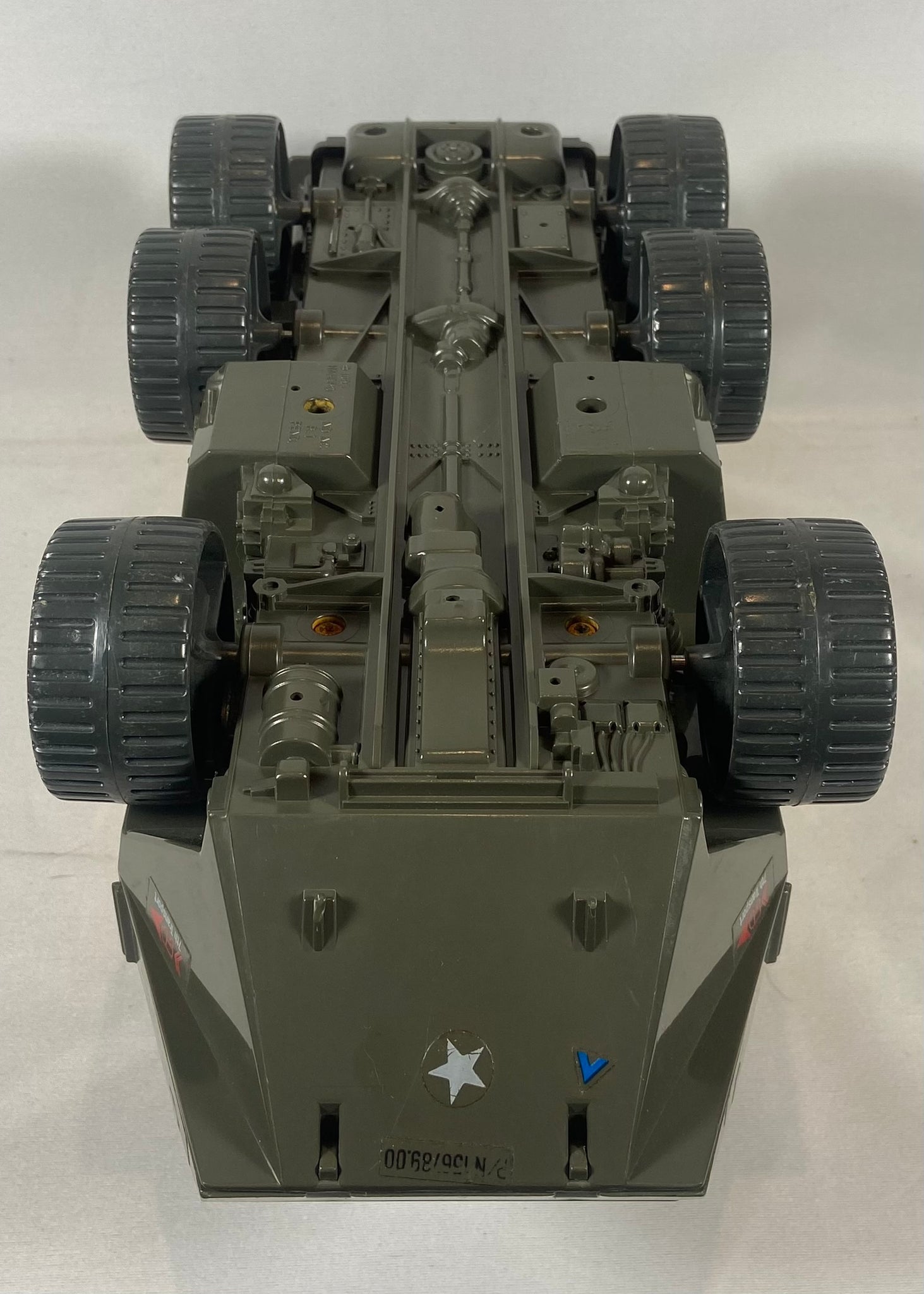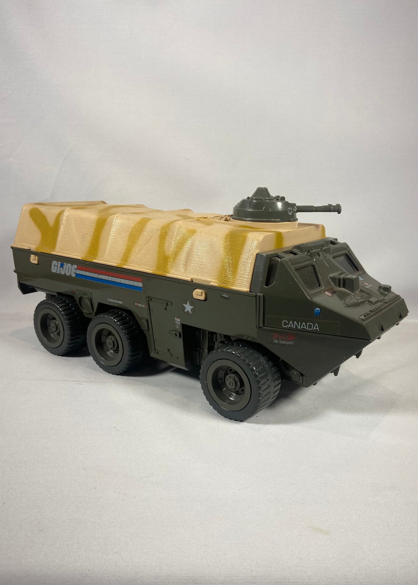 Véhicule APC (Amphibious Personnel Carrier) original de la gamme G.I. Joe de 1983 par Hasbro. Version canadienne avec marquages visibles. Modèle robuste avec roues fonctionnelles, espace intérieur pour figurines 3.75’’ et capot supérieur amovible.