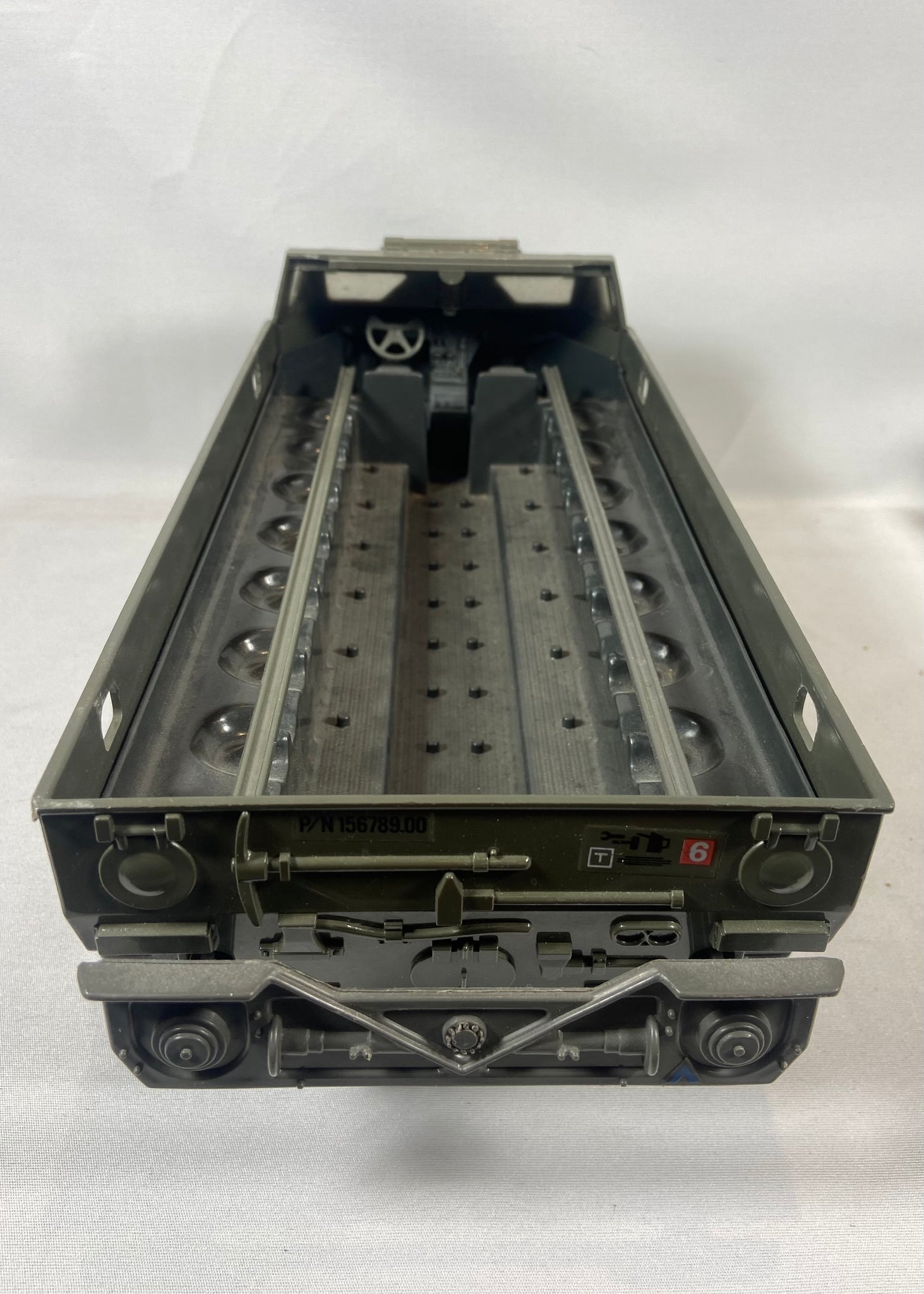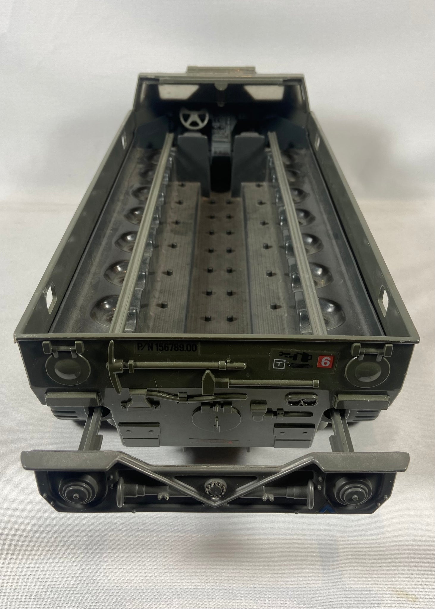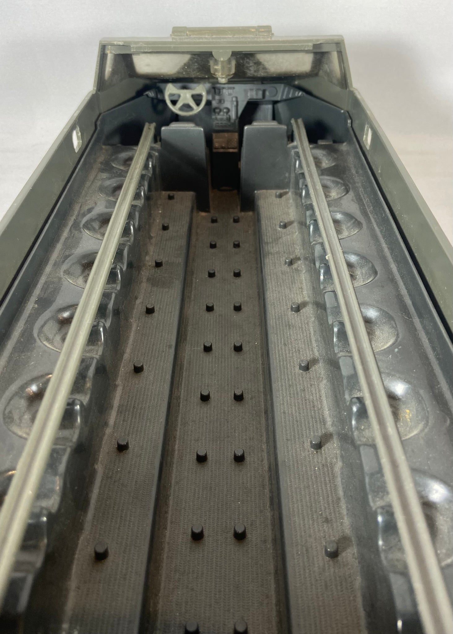 Véhicule APC (Amphibious Personnel Carrier) original de la gamme G.I. Joe de 1983 par Hasbro. Version canadienne avec marquages visibles. Modèle robuste avec roues fonctionnelles, espace intérieur pour figurines 3.75’’ et capot supérieur amovible.