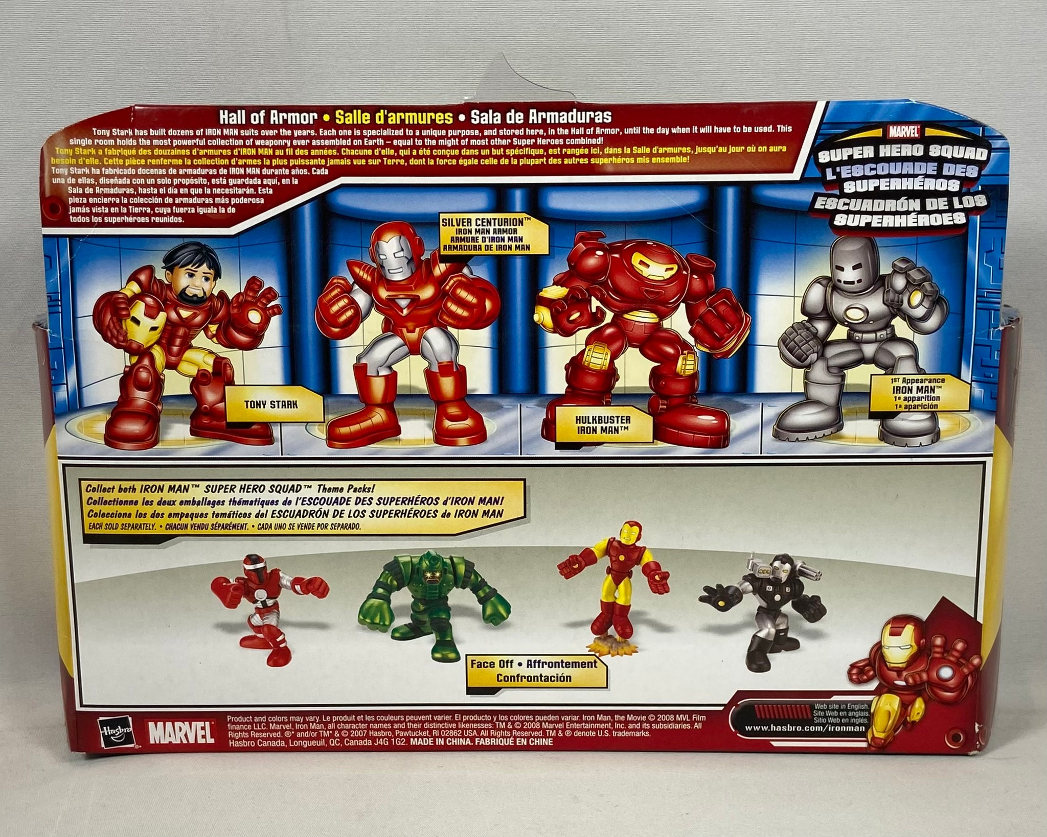 Ensemble officiel Marvel Super Hero Squad – Iron Man Hall of Armor, comprenant plusieurs figurines Iron Man emblématiques, incluant Tony Stark, Silver Centurion, Hulkbuster et une armure Iron Man classique.