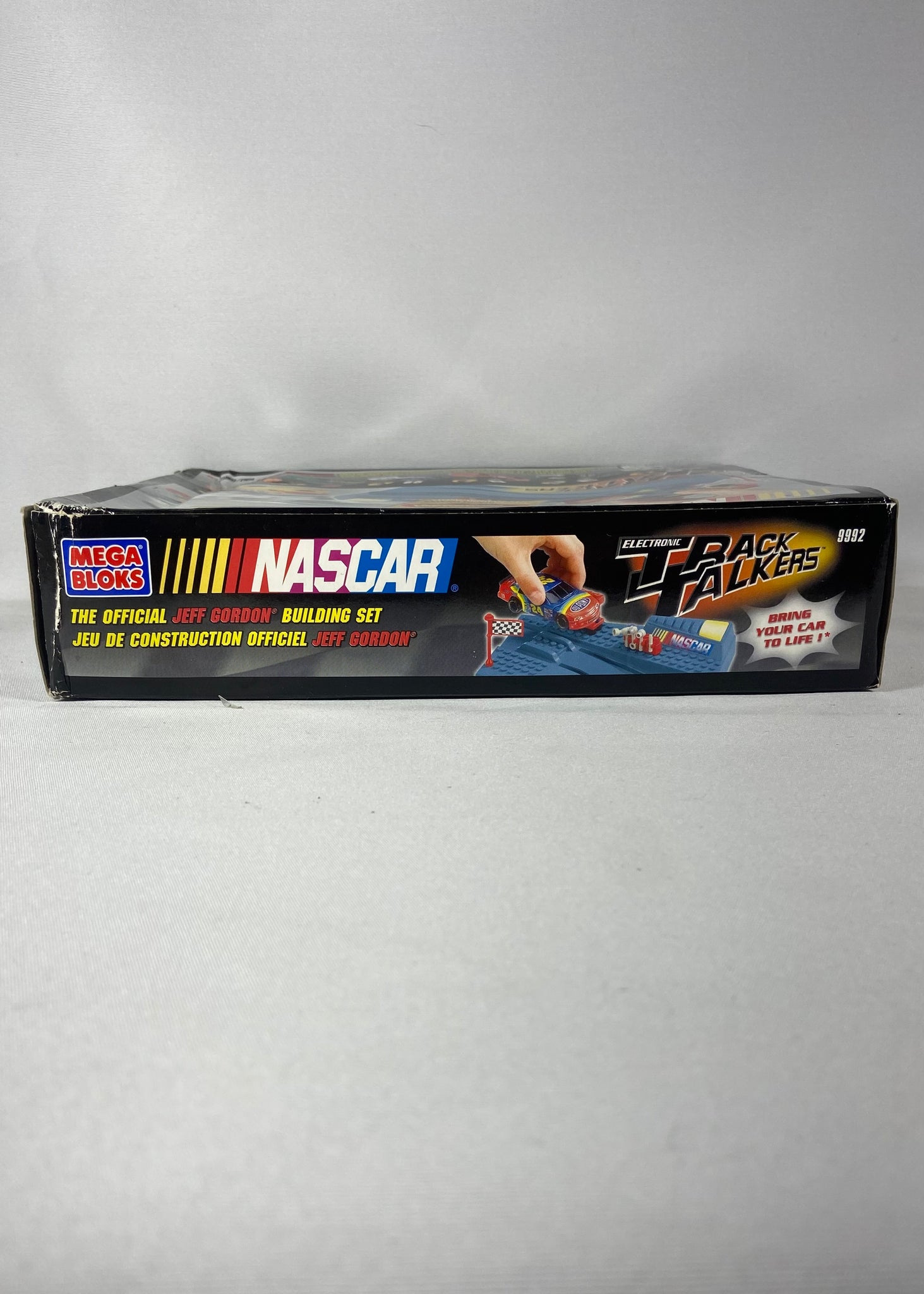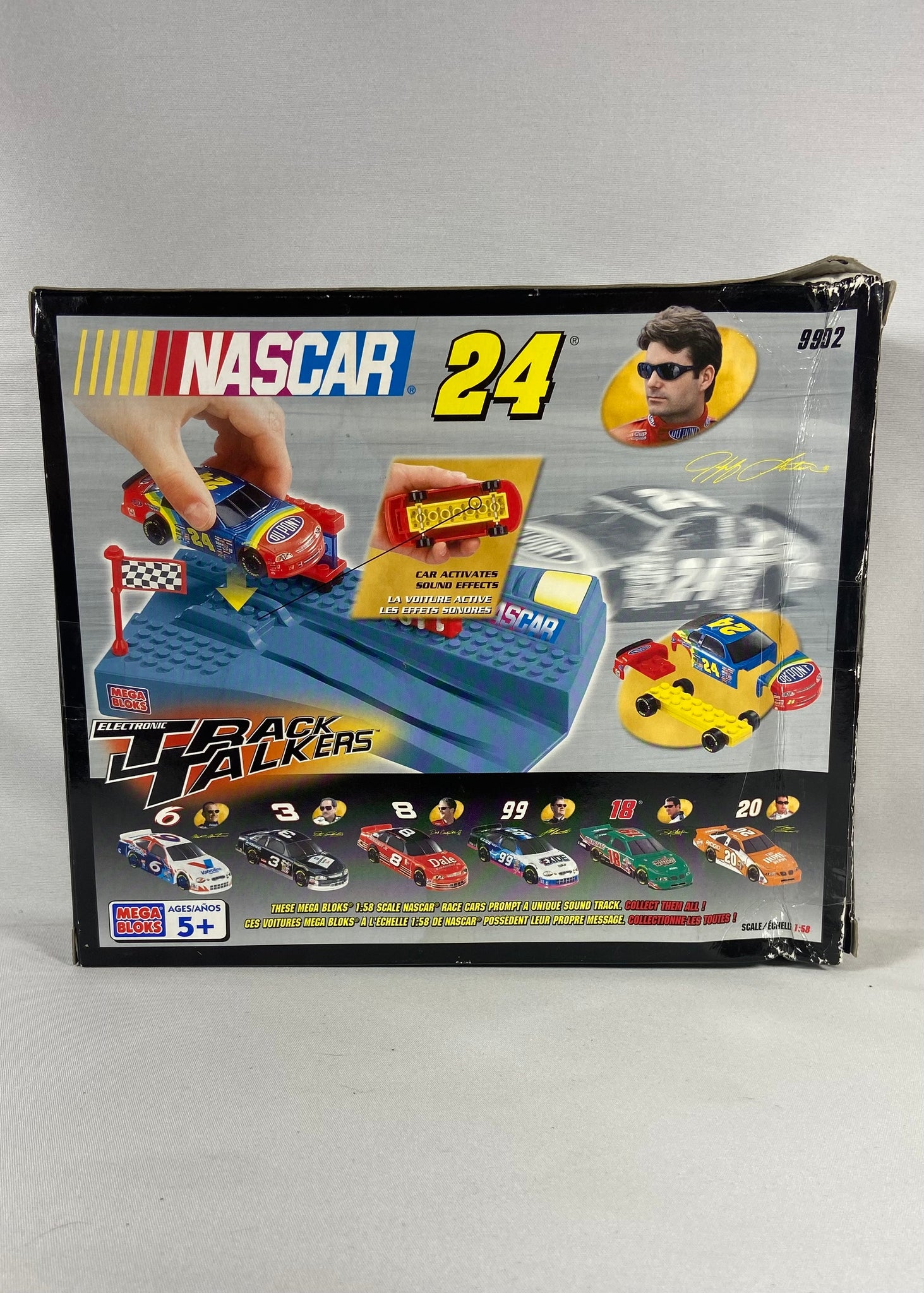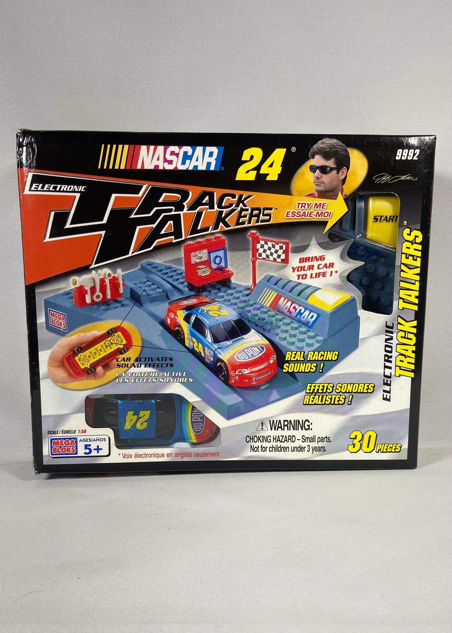 Ensemble de construction électronique Mega Bloks NASCAR Track Talkers, modèle #24 de Jeff Gordon. Comprend une voiture à l’échelle 1:58, une base activatrice d’effets sonores et 30 pièces thématiques. Appuyez la voiture sur la station pour déclencher des sons réalistes de course. Un ensemble vintage prisé par les collectionneurs NASCAR et les amateurs de jouets Mega Bloks discontinués.
