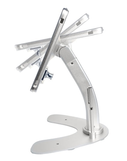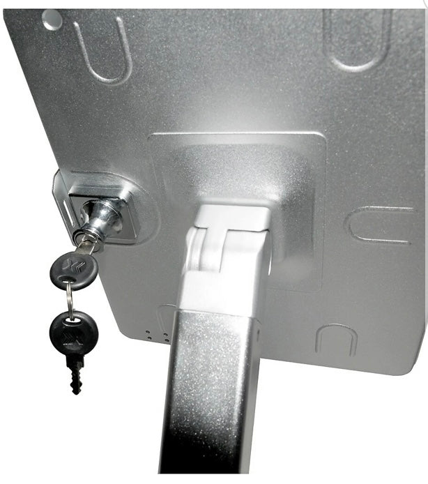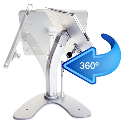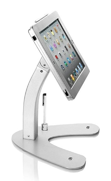 Ce support est fabriqué en aluminium solide et élégant et est parfait pour servir de poste de travail, de présentoir de kiosque ou de support de iPad au point de vente au détail. Le boîtier en aluminium moulé est conçu pour un iPad de 2e à 4e génération avec des ouvertures pour les caméras et les ports. Il est également compatible avec l’iPad Air et l’iPad Air 2. Le boîtier s’incline pour procurer des angles de visionnement réglables et pivote à l’horizontale et à la verticale. La base peut également pivoter à 360 degrés pour faciliter les transactions d’un côté ou l’autre de la caisse. Le boîtier antivol est bien verrouillé en place et est accessible avec les clés incluses. La base est large et solide pour plus de stabilité et elle peut aussi être fixée à un bureau ou à un comptoir grâce aux trous prépercés. Le matériel de montage est inclus pour une installation facile et une sécurité accrue. Le boîtier et le bas de la base sont également rembourrés pour mieux protéger votre appareil et vos meubles.
