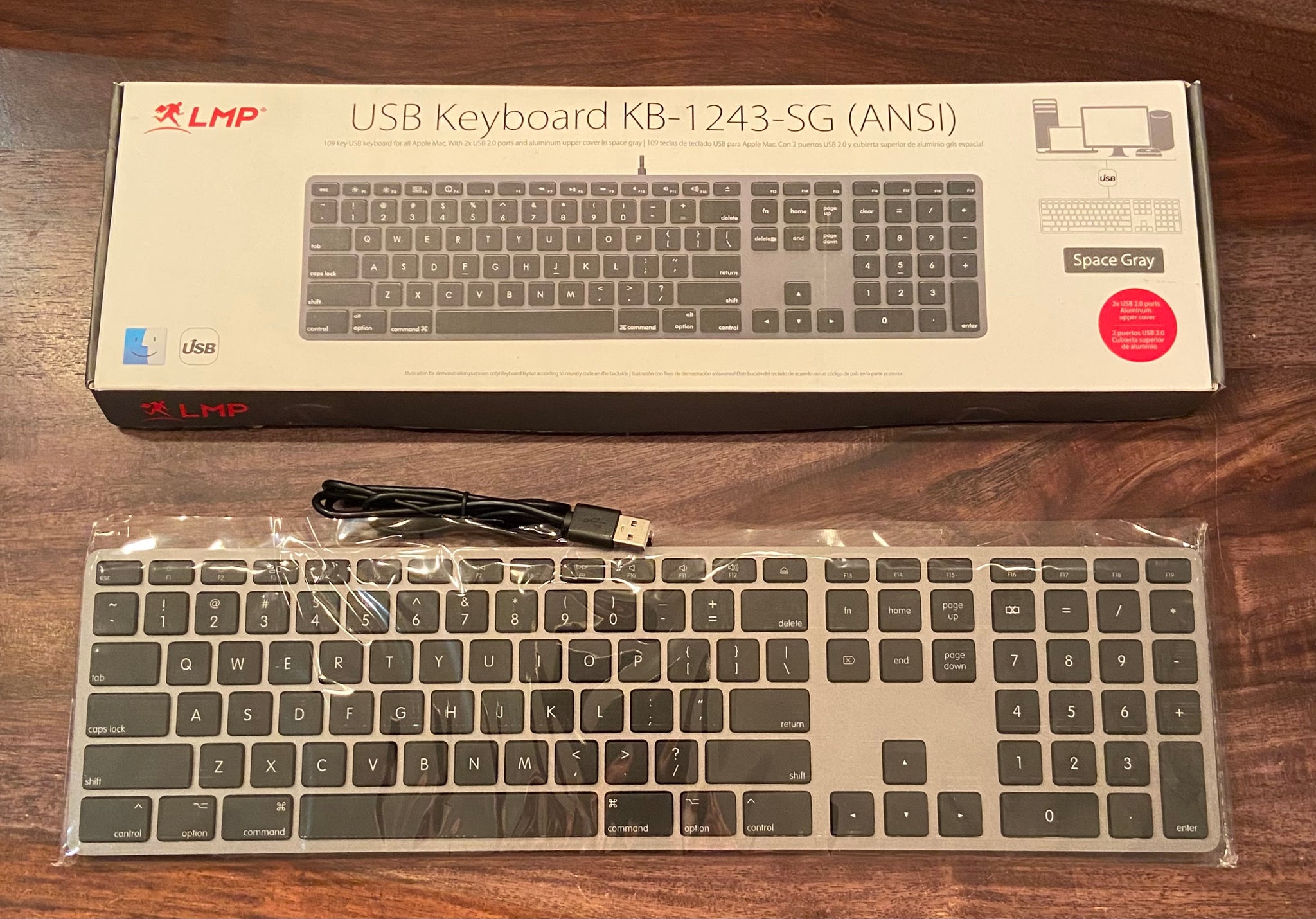 Le nouveau clavier USB LMP KB-1243 est une alternative économique au clavier Apple Magic et peut être utilisé avec n'importe quel Mac avec port USB. Le clavier USB filaire robuste à 3 zones avec 109 touches (ANSI) et couvercle supérieur en aluminium comprend un pavé numérique (qui comprend le signe « = ») et deux ports USB 2.0 supplémentaires pour les périphériques à faible consommation d'énergie. Les touches sont gravées au laser et ont une sensation tactile traditionnelle. Le KB-1243 peut être utilisé pour les Mac/Mac OS X vintage ainsi que pour les Mac/macOS actuels.