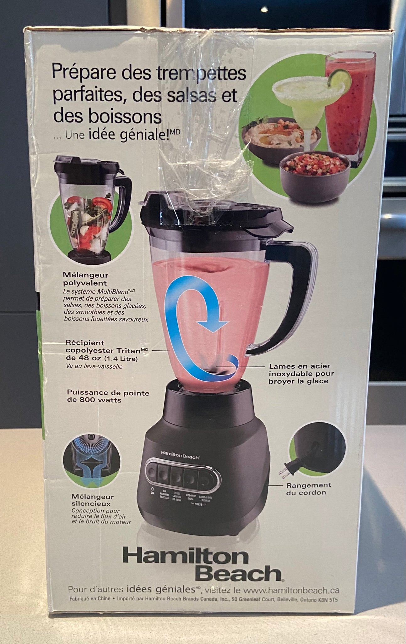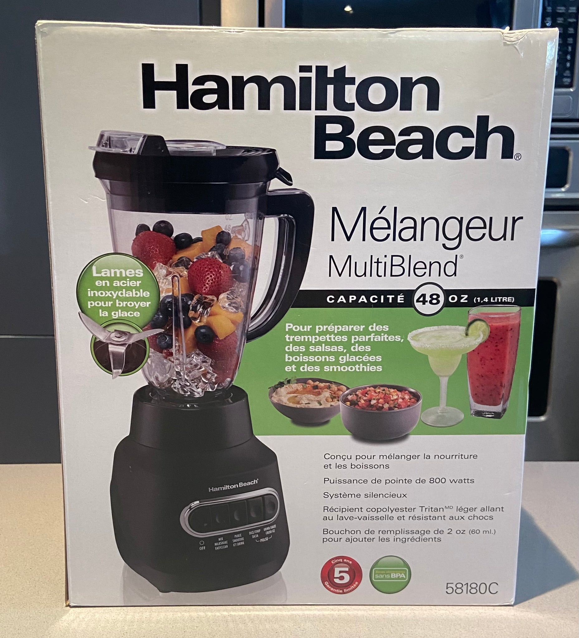 Avec sa capacité à mélanger à la fois les aliments et les boissons, le mélangeur Hamilton Beach® MultiBlend® gagnera sa place sur vos comptoirs. Des lames en acier inoxydable qui écrasent la glace et un moteur de puissance de crête de 800 watts facilitent la préparation de trempettes parfaites, de salsa, de boissons glacées, de smoothies et plus encore. Les 48 onces. le pot de mélange en plastique est léger, incassable et sans BPA. Le couvercle comporte un 2 oz. bouchon de remplissage pour ajouter des ingrédients pendant l'utilisation, comme lorsque vous avez besoin d'un filet d'huile pour un pesto rapide ou pour ajouter un peu plus de poudre de protéines à votre shake du matin. La base a même été conçue avec une conception en instance de brevet pour réduire le bruit du moteur. Quand il est temps de nettoyer, les lames et le bocal en verre sont amovibles et vont au lave-vaisselle.